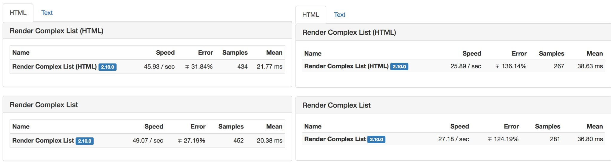 Checking my prior results for ember 2.10, render complex list, using Chrome latest on each: